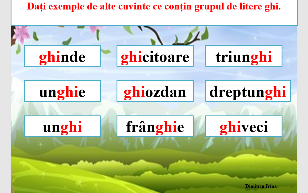 Abecedar_Grupul de litere „ghi” și „Ghi”. Textul „Ghiocelul”. Partea 1