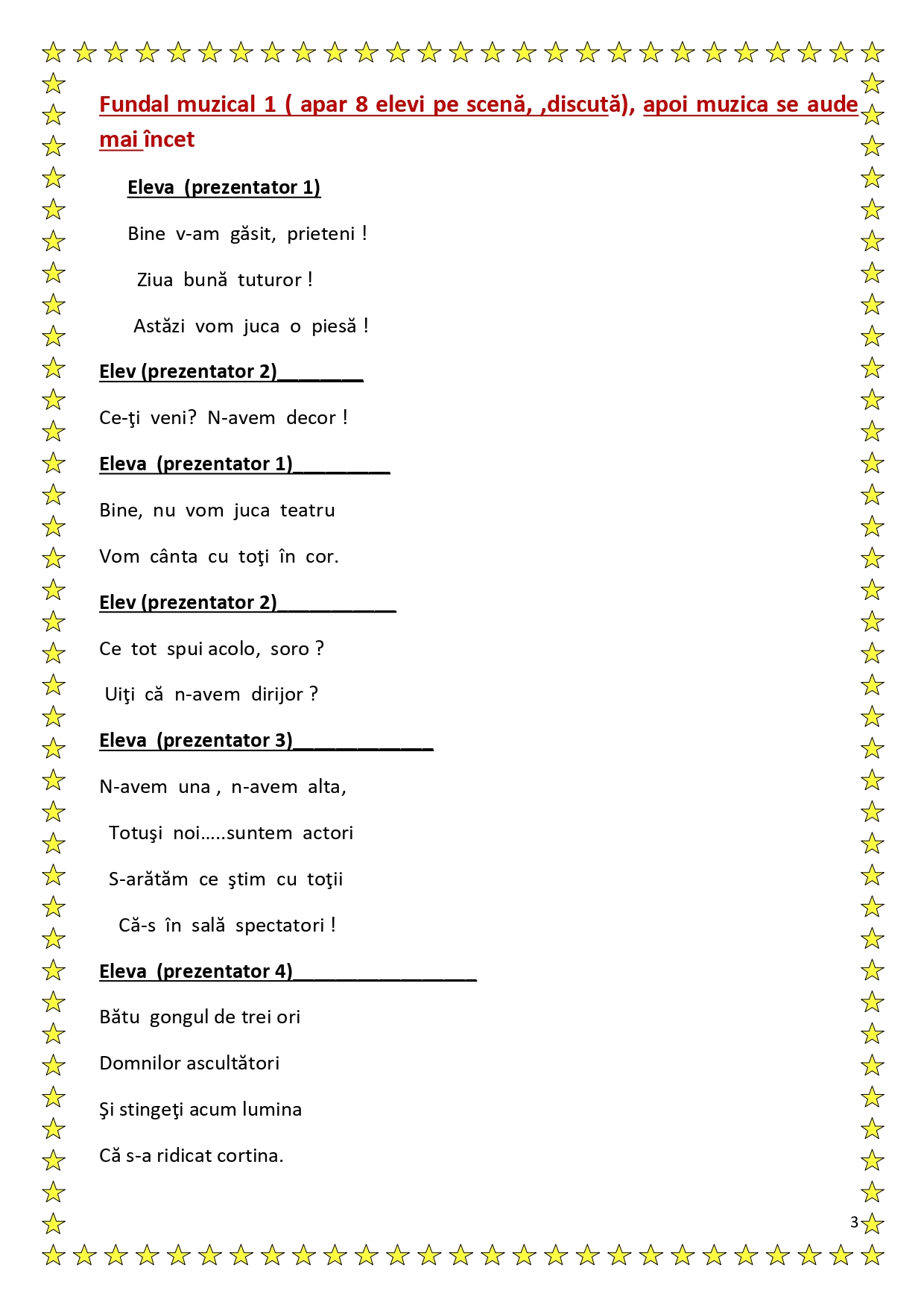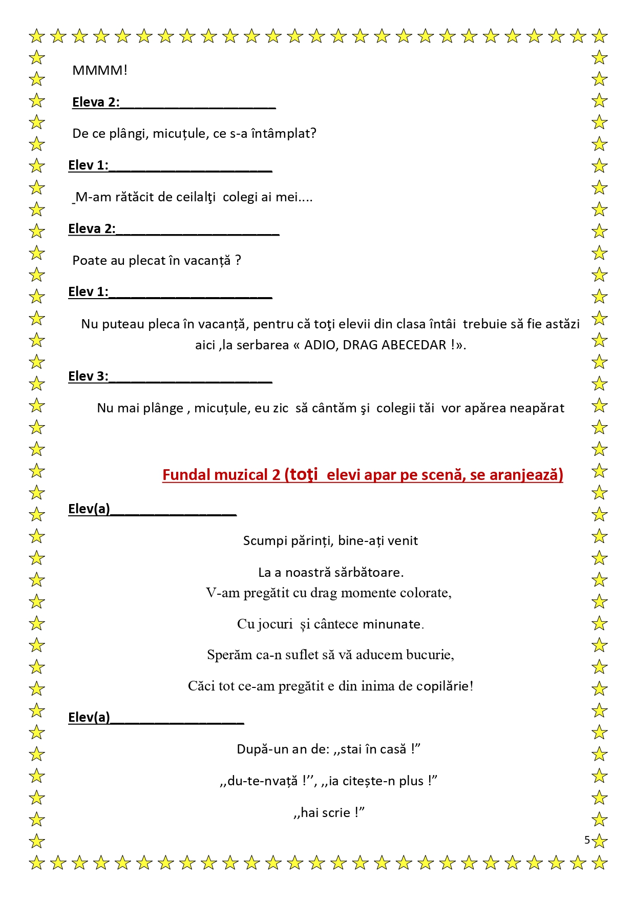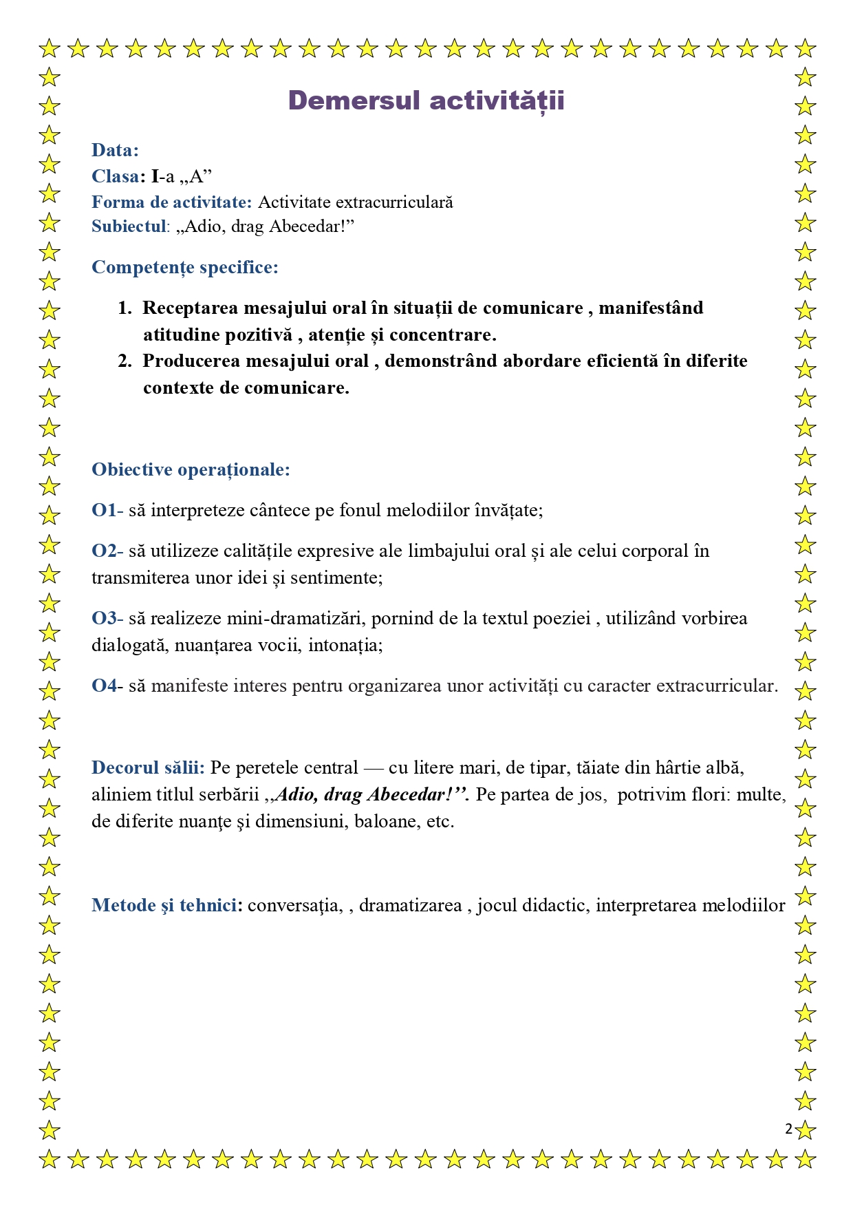 Scenariul didactic al acestei activități extracurriculare, redactat în format Word pe 50 pagini, reprezintă un ghid complet pentru organizarea și desfășurarea serbării. Elaborat cu respectarea cerințelor metodice specifice, acest material oferă idei creative și structurate, menite să transforme activitatea într-o experiență educativă și memorabilă pentru elevi.