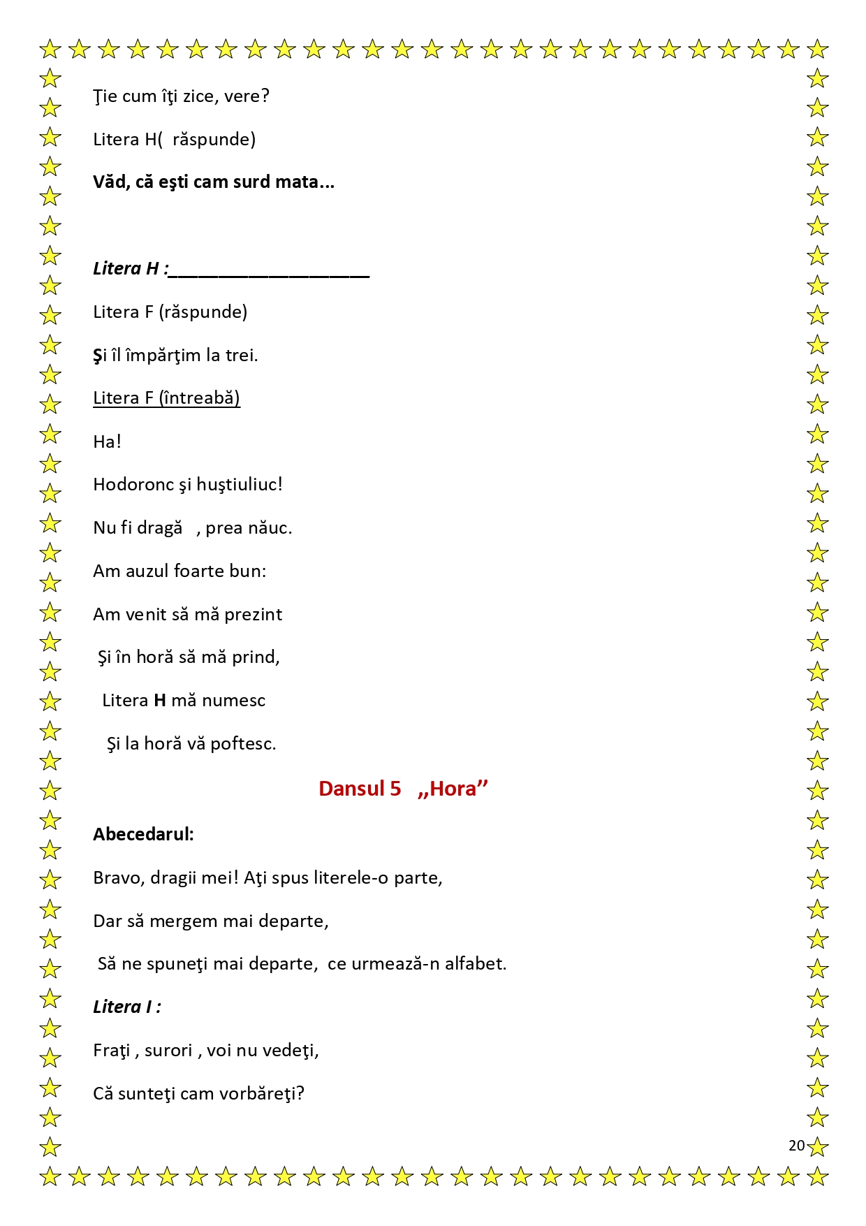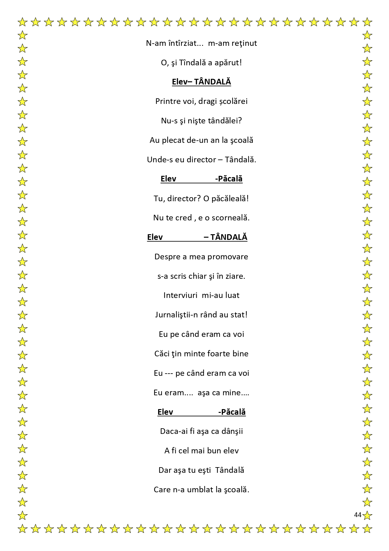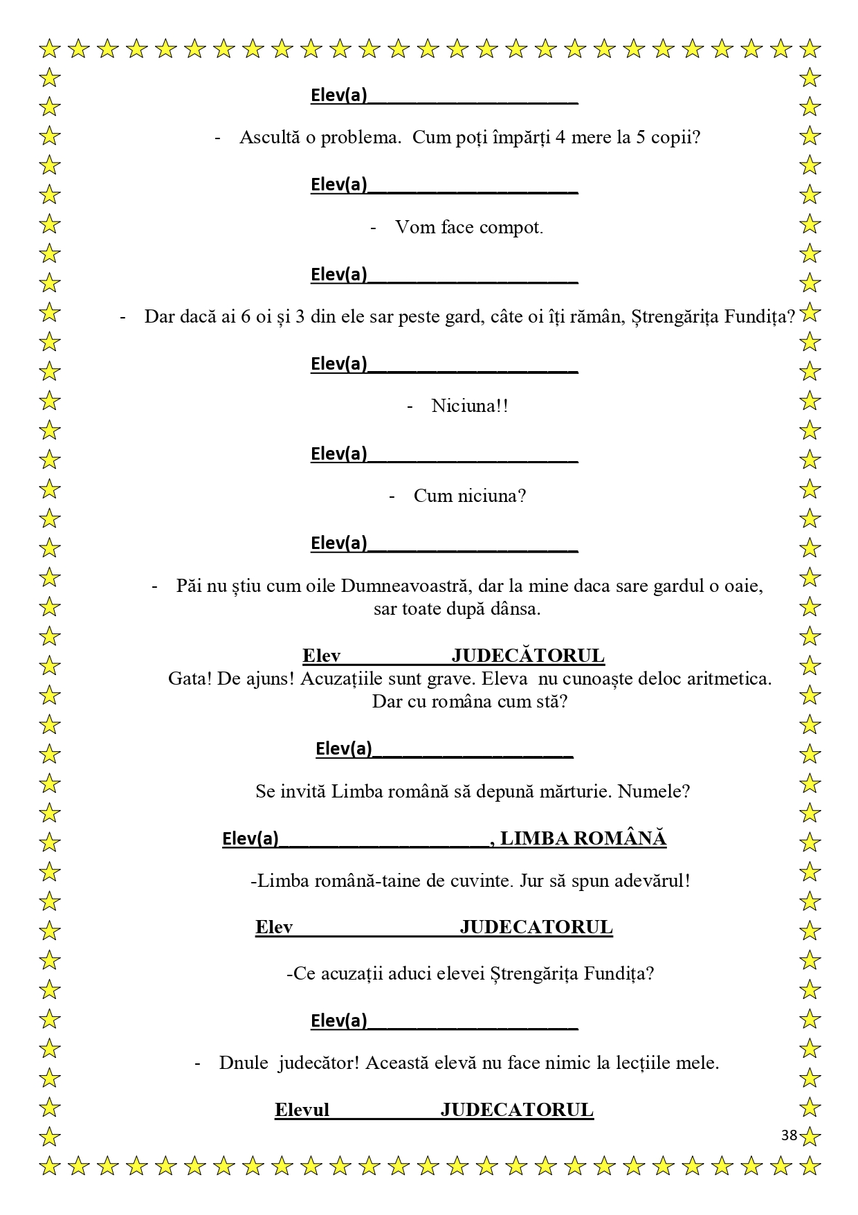 Sceneta specială „Judecata Literelor cu Tandala și Păcală” aduce umor, interactivitate și surprize! Literele își demonstrează importanța, disciplinele școlare trec printr-o „judecată veselă”, iar elevii sunt protagoniști: votează, răspund la întrebări și participă la probe amuzante.