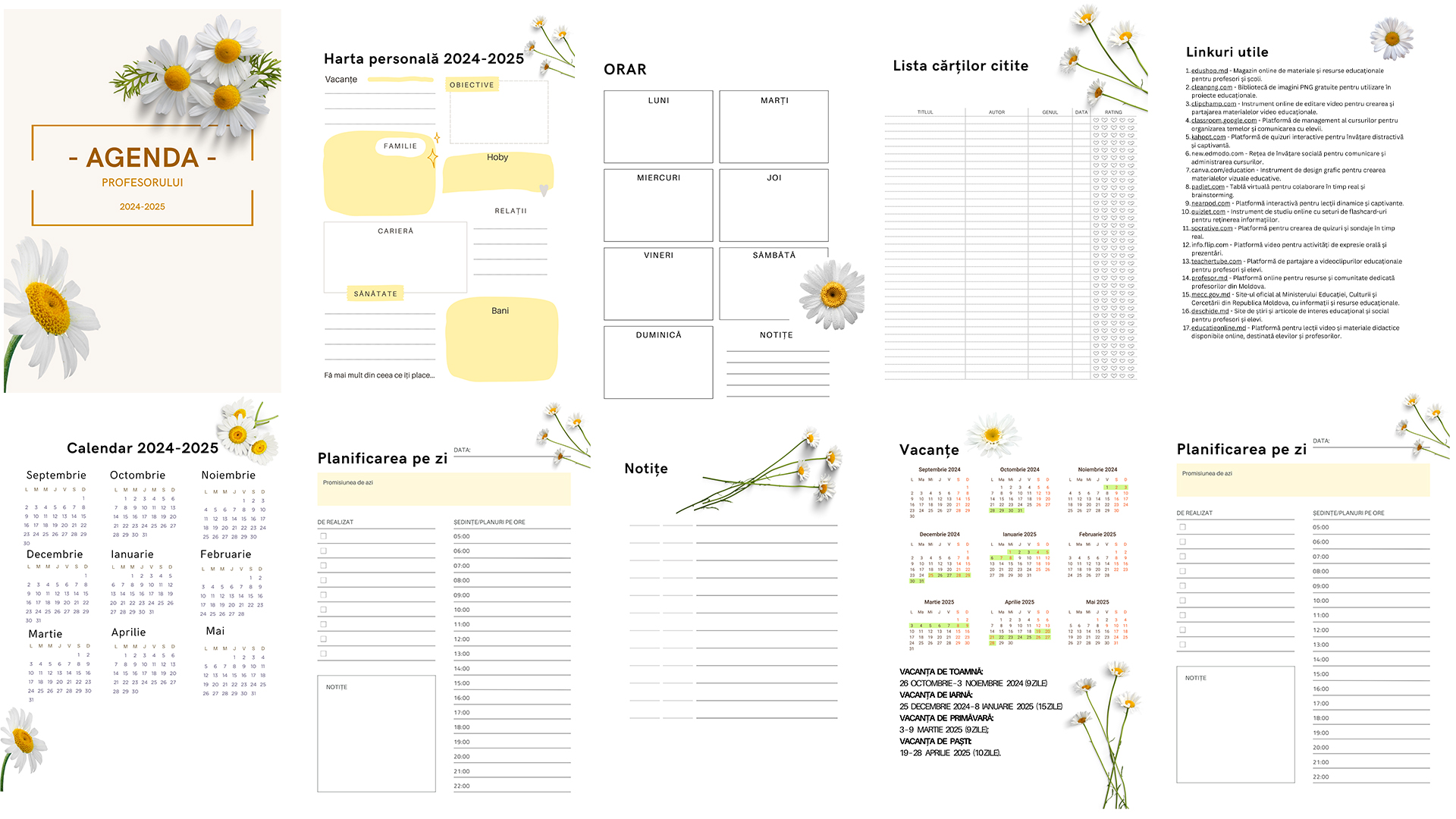 Agenda profesorului cuprinde 14 pagini imprimabile în format A4 sau A5 ce include:
