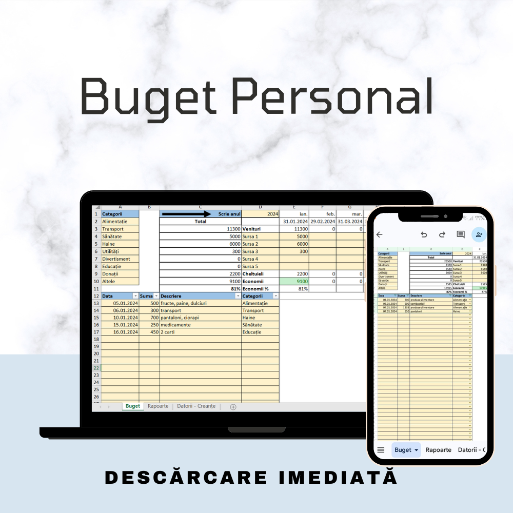 Acest șablon Excel de buget personal este instrumentul ideal pentru a vă gestiona eficient finanțele. Conceput pentru a fi simplu și intuitiv, vă ajută să urmăriți veniturile și cheltuielile, să stabiliți obiective financiare și să identificați oportunitățile de economisire.