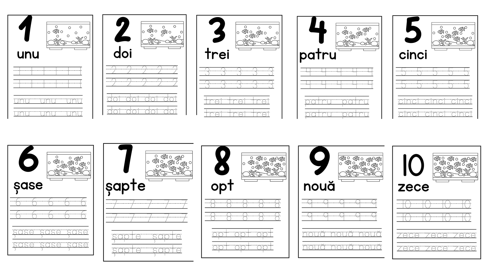 Fișierul este în format PDF și conține 10 foi cu cifrele 1-10 de scris și colorat