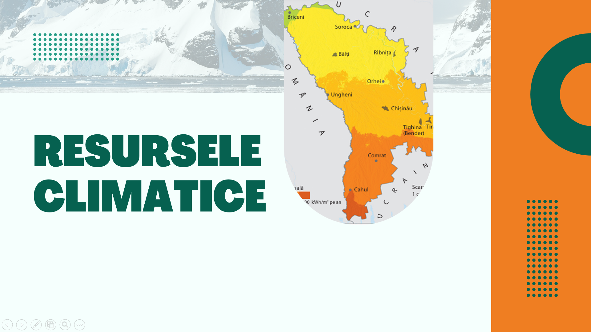 Prezentarea contine 18 diapozitive cu diverse sarcini care faciliteaza intelegerea notiunilor de resurselor de energie eoliana si solara, resursele agroclimatice si resursele de apa(apele subterane, apele de suprafata), reteaua de apeducte, deosebiri ditre resurse climatice si agroclimatice.