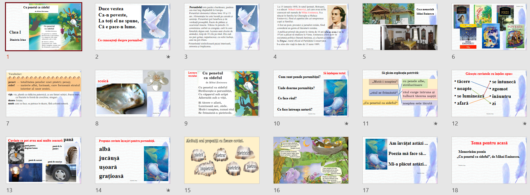 Această prezentare PowerPoint este destinată elevilor din clasa I și se bazează pe poezia „Cu penetul ca sideful” de Mihai Eminescu. Lecția include activități care ajută copiii să înțeleagă simbolismul porumbelului, o pasăre ce simbolizează pacea, armonia și împăcarea. Elevii vor descoperi detalii despre porumbel, cum ar fi dieta acestuia, comportamentul în pereche și procesul de creștere a puilor.