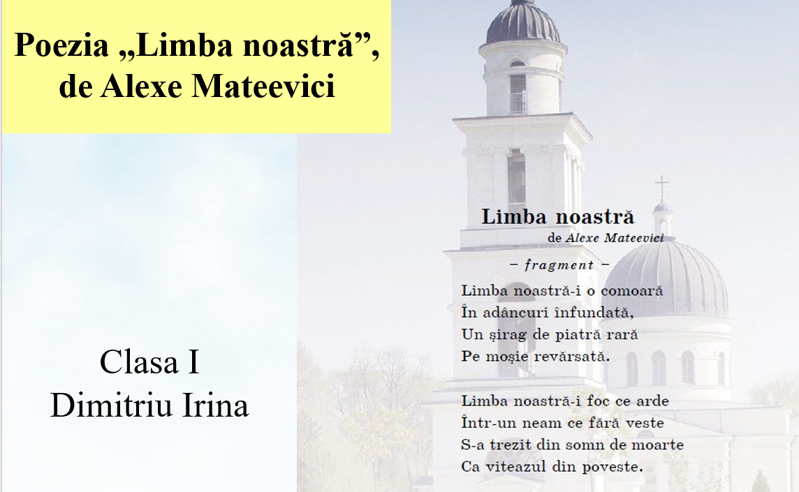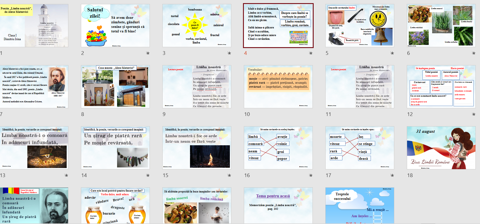 Alexei Mateevici, autorul acestei poezii, este prezentat într-o scurtă biografie, iar elevii vor învăța despre importanța limbii române în viața lor. În plus, prezentarea stimulează gândirea creativă prin identificarea și asocirea versurilor din poezie cu imagini corespunzătoare, sprijinind dezvoltarea abilităților de citire și înțelegere a textului.