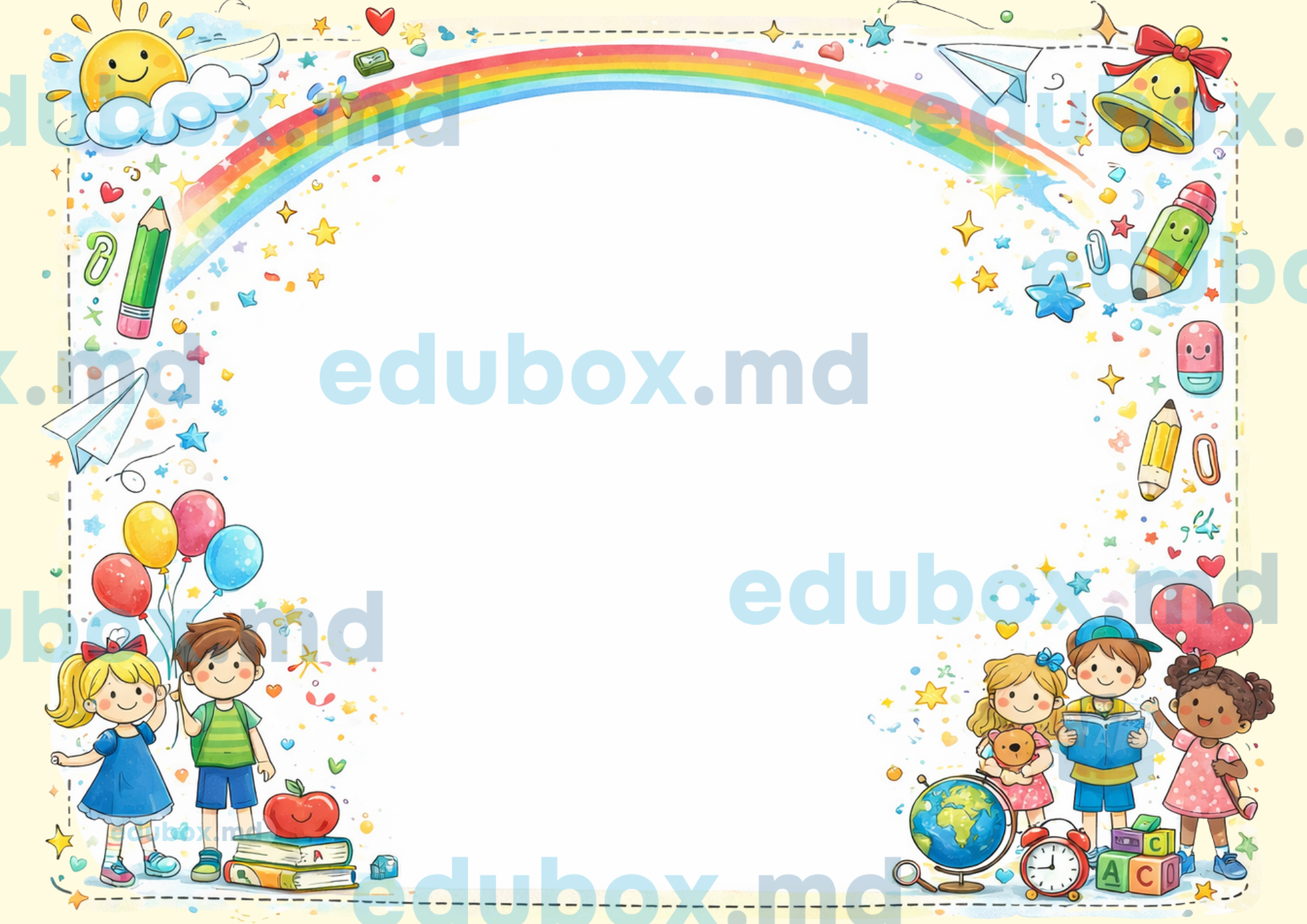Designul este ilustrat în stil jucăuș, cu elemente specifice școlii, culori vii și spațiu generos pentru personalizare.