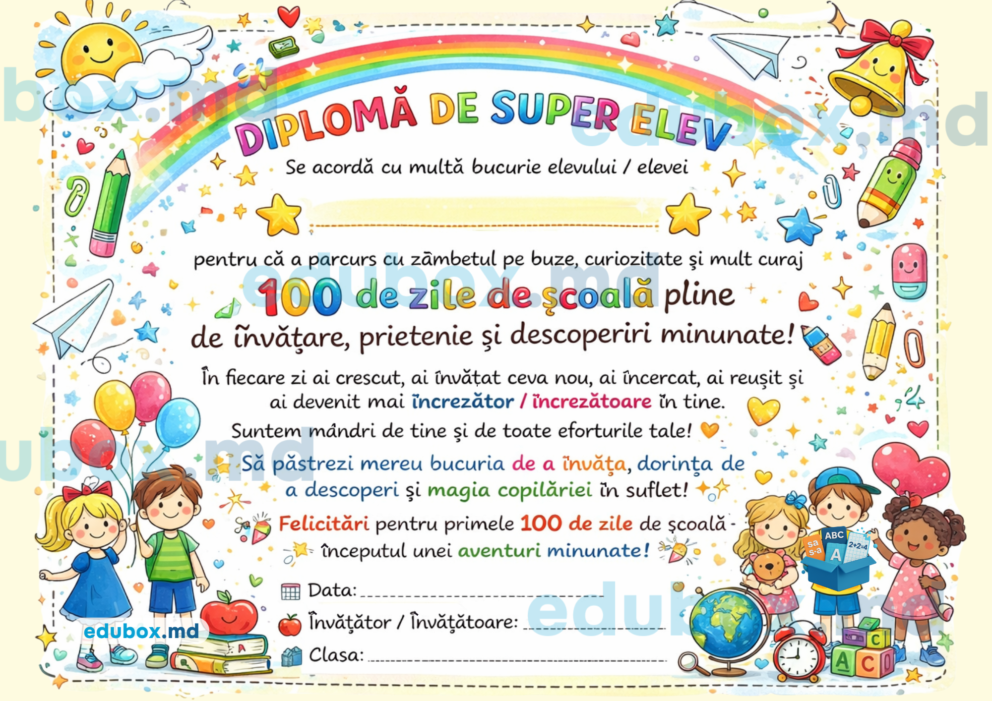 Diplomă colorată și prietenoasă, creată special pentru a marca momentul minunat al primelor 100 de zile de școală. Perfectă pentru clasele primare, festivități tematice sau activități de clasă.