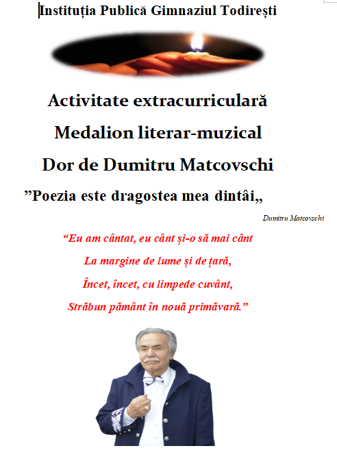 Acest document digital în format .docx conține scenariul unei activități extracurriculare dedicate marelui poet și scriitor Dumitru Matcovschi. Materialul are titlul „Poezia este dragostea mea dintâi” și include fragmente lirice reprezentative, printre care și poezia: