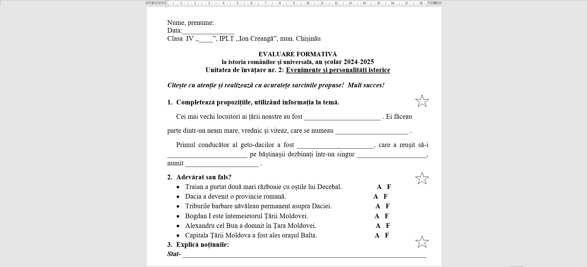 Evaluare formativă la istoria românilor și universală „Evenimente și personalități istorice”, modulul 2, clasa 4 [fișier .DOCX]