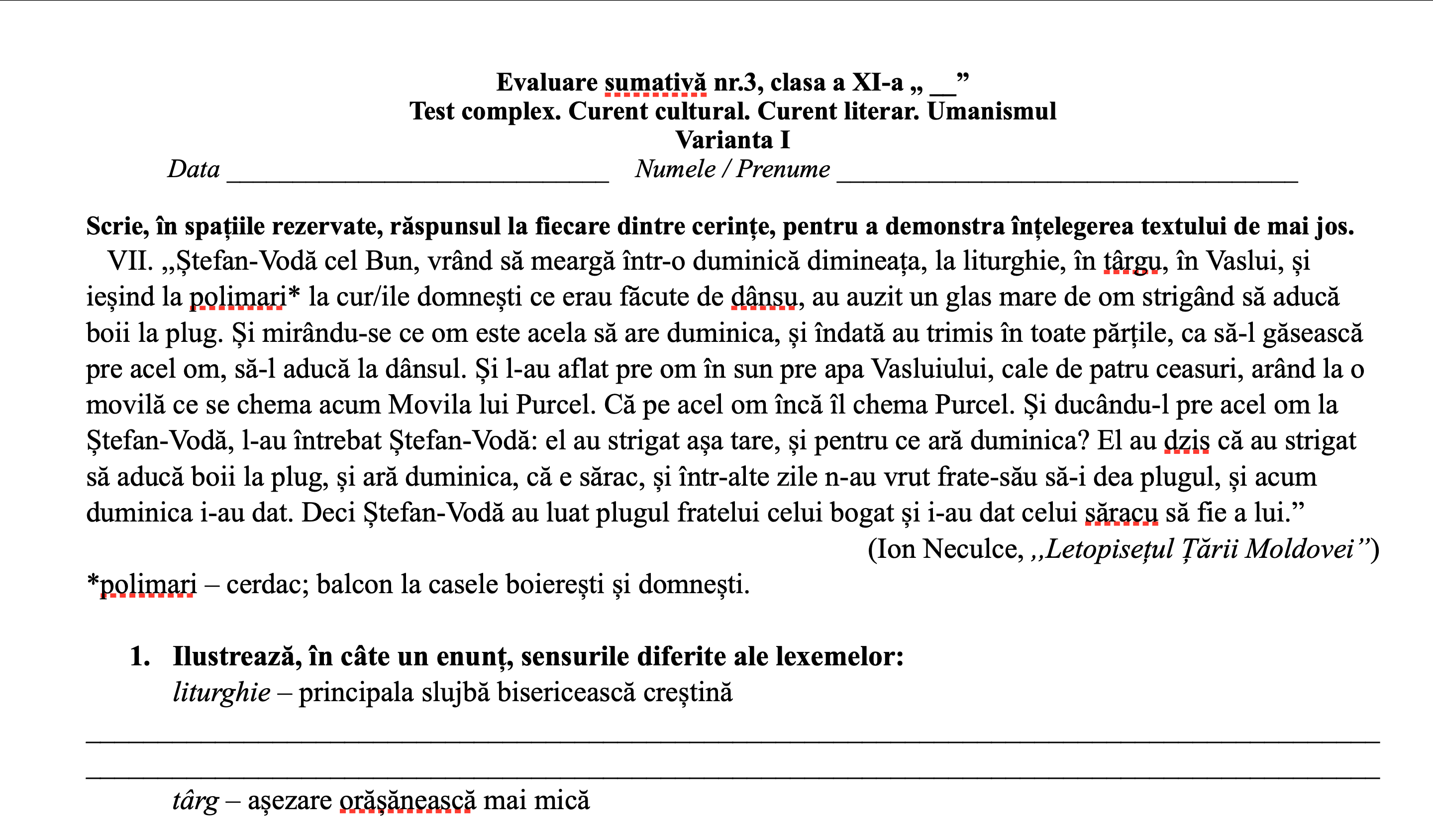 Acest produs digital este o evaluare sumativă complet structurată pentru clasa a XI-a, construită în concordanță cu cerințele studierii curentului cultural și literar Umanismul. Materialul include două variante de test, texte-suport autentice din literatura veche, exerciții moderne de analiză, itemi variati (I–VII), cerințe de vocabular, gramatică, interpretare și un eseu final.