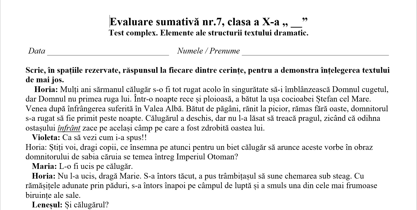Evaluare sumativă nr.7 Genul dramatic. Elemente ale structurii textului dramatic [fișier .DOCX]