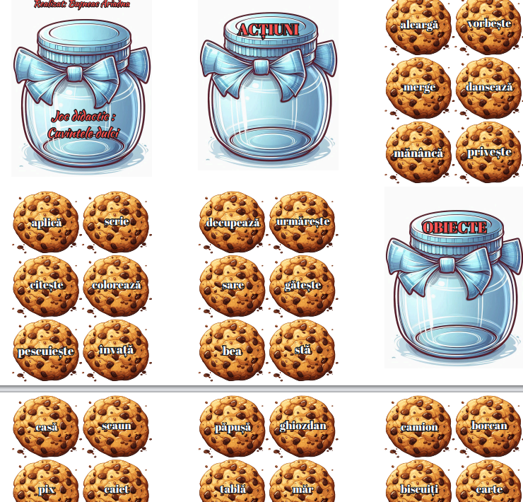 Copii citesc cuvintele scrise pe biscuiți și îi plasează în borcanul corespunzător ( acțiuni, însușiri, obiecte, ființe, fenomene ale naturii).