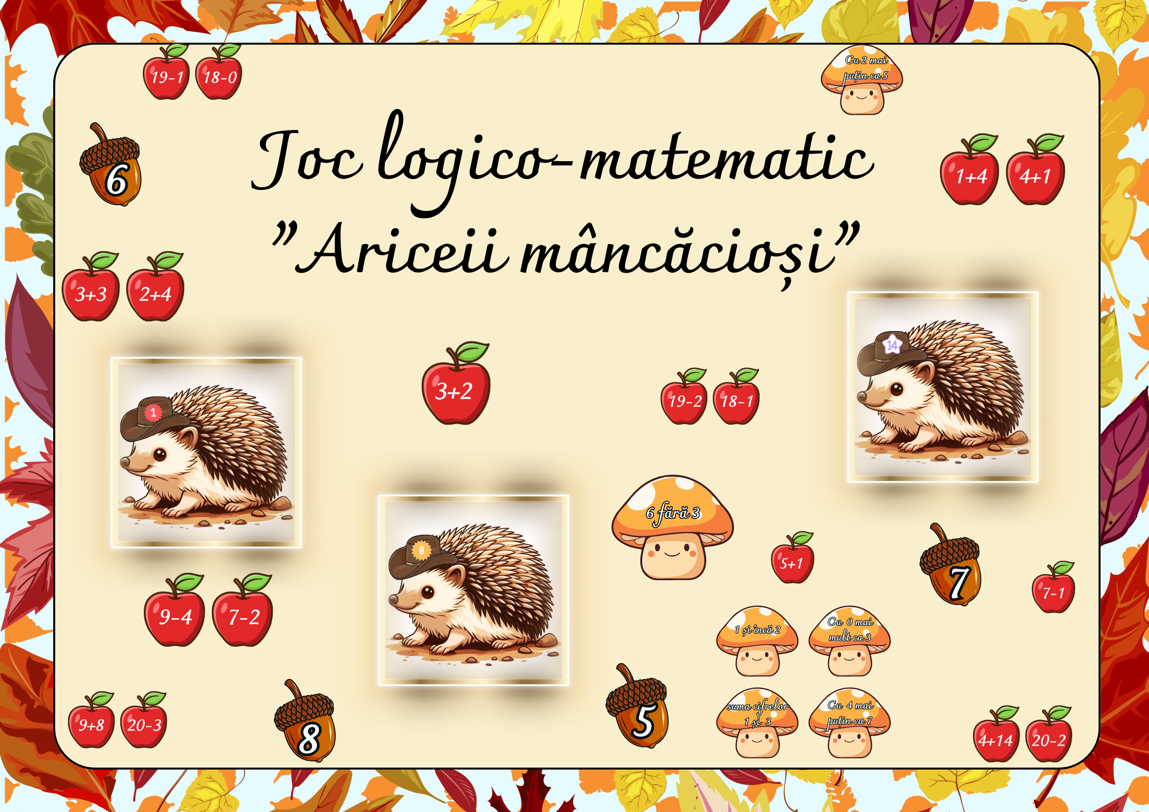 1. Copii vor calcula operațiile indicate pe mere apoi le vor aranja la ariciul cu cifra corespunzătoare sumei/diferenței.