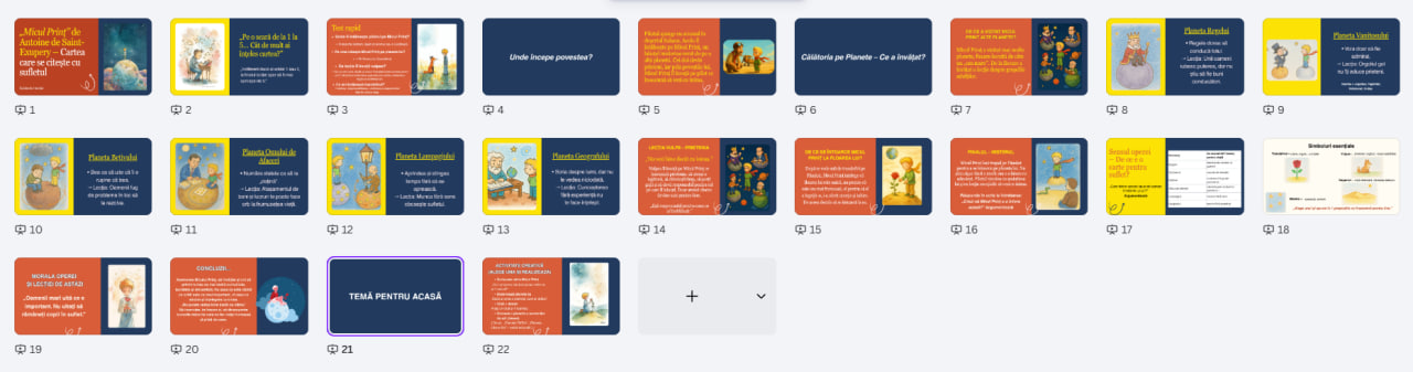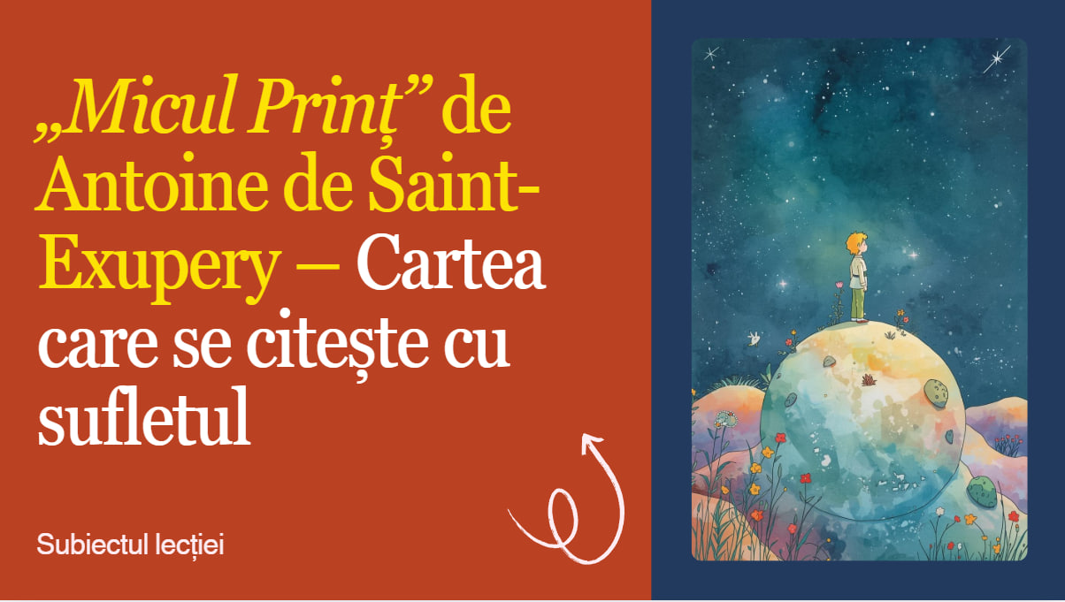 Acest material didactic digital este o prezentare PPT, pusă la dispoziție în format PDF, concepută pentru studierea operei „Micul Prinț” de Antoine de Saint-Exupéry, în cadrul orelor de limba și literatura română.