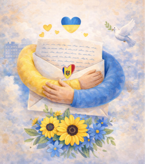 🕊️ pagină ilustrată tematic (îmbrățișare simbolică Moldova–Ucraina)