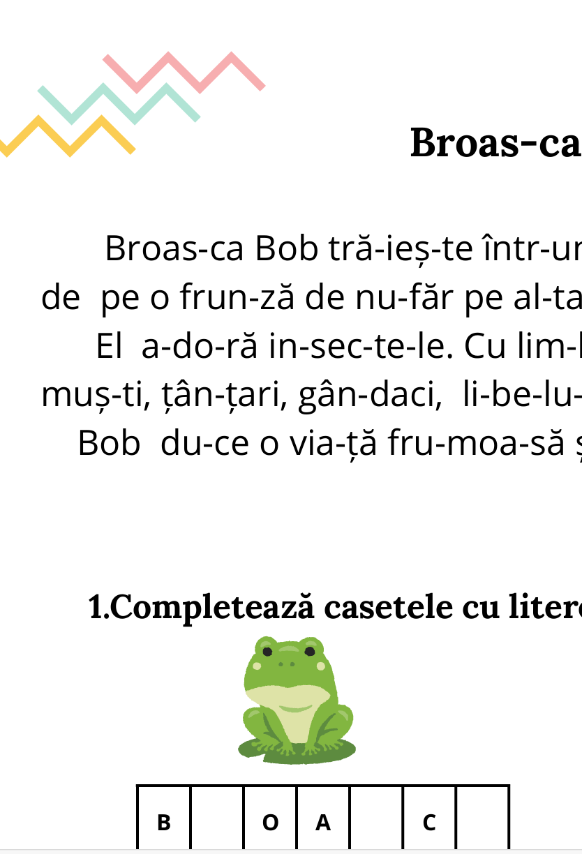 Această fișă este un suport excelent pentru copiii care merg în clasa I. Prima pagină cuprinde un text interesant cu cuvinte clare, toate împărțite pe silabe. După text urmează sarcini: de completare a literelor care lipsesc și identificare a consoanelor și vocalelor. Pe partea a doua este o liniatură și cuvinte retrase din text care trebuie scrise cu litere de tipar pe spațiul dat.