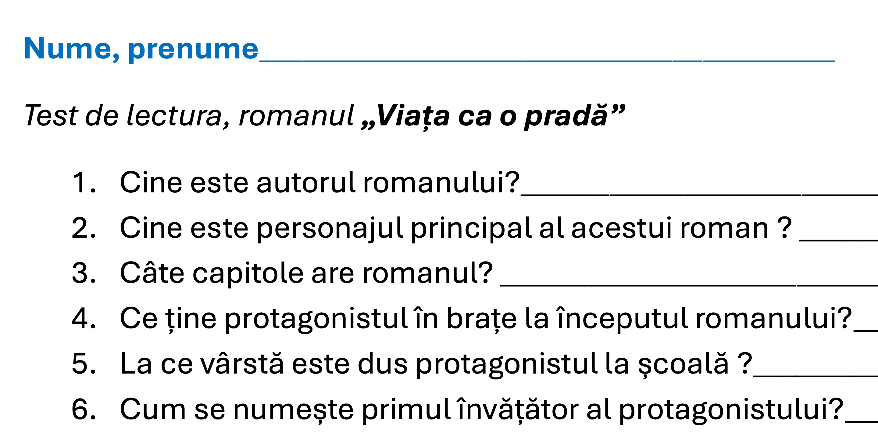 Testul conține 20 întreîntrebări in baza textului,  cu 20 de spațispații rezervate pentru a răspunde elevii.