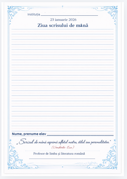 Fișă educațională A4, creată special pentru marcarea Zilei scrisului de mână (23 ianuarie). Conține rânduri pe toată pagina, potrivite pentru dictare, compuneri sau exerciții de caligrafie, destinată elevilor din ciclul primar și gimnazial.