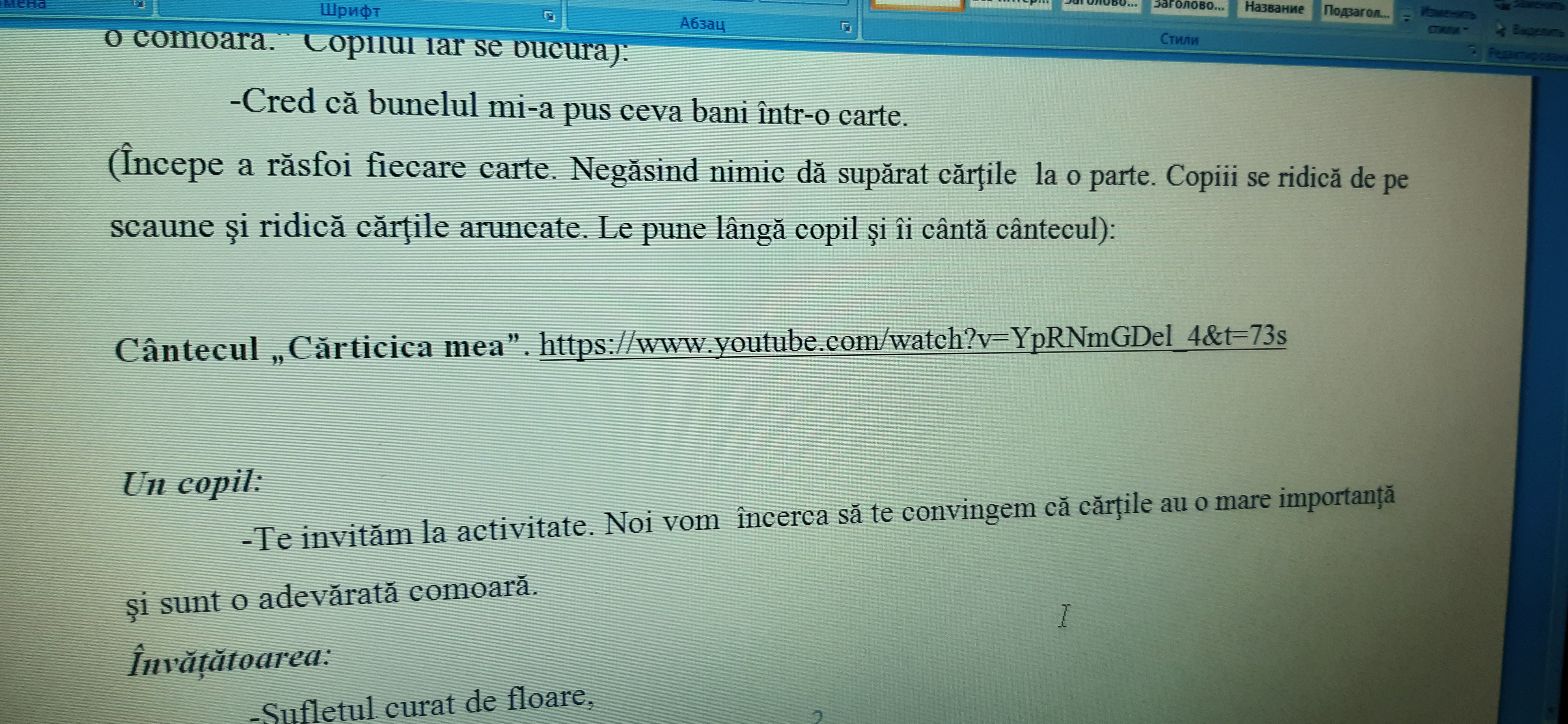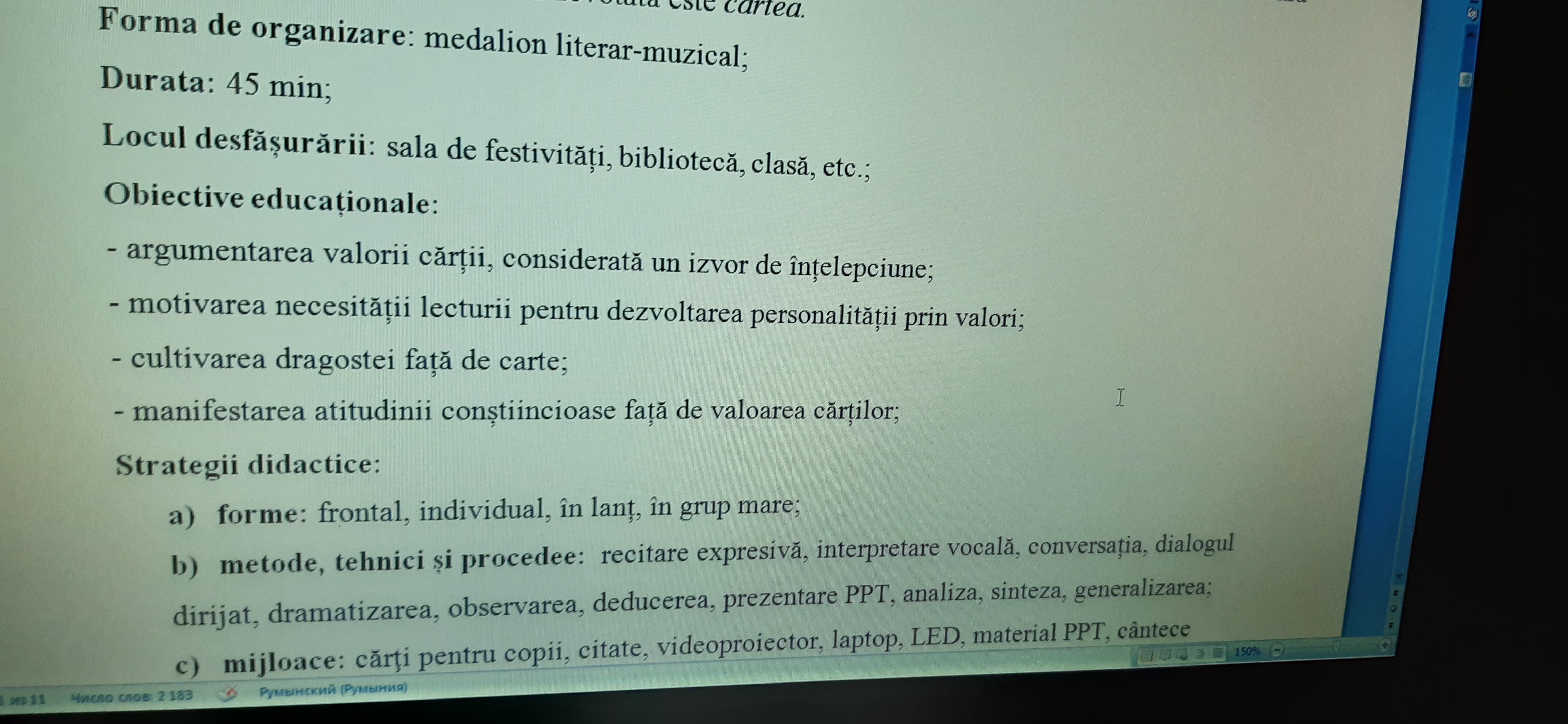 Conține: ARGUMENT bine determinat, OBIECTIVE OPERAȚIONALE corect formulate, STRATEGIA DIDACTICĂ cu forme, metode, tehnici și procedee didactice, DECORUL SĂLII cu mijloace didactice, REFERINȚE BIBLIOGRAFICE scrise după cerințele actuale, cu indicarea ISBN-ului literaturii metodice. Scenariul didactic conține și linkurile la cântece, filmulețe educative, audiții, melodii, etc. DESIGNUL este interactiv, creativ și relevant. Poate fi utilizat și la activități transdisciplinare, la toate treptele școlare. Activitatea este bogată în conținut. Scenariul didactic este structurat corect, din punct de vedere metodic și bine gândit. Este recenzat la CATEDRA ȘTIINȚE ALE EDUCAȚIEI de la UNIVERSITATEA de STAT „Alecu Russo” din Bălți și recomandat pentru publicare și utilizare.