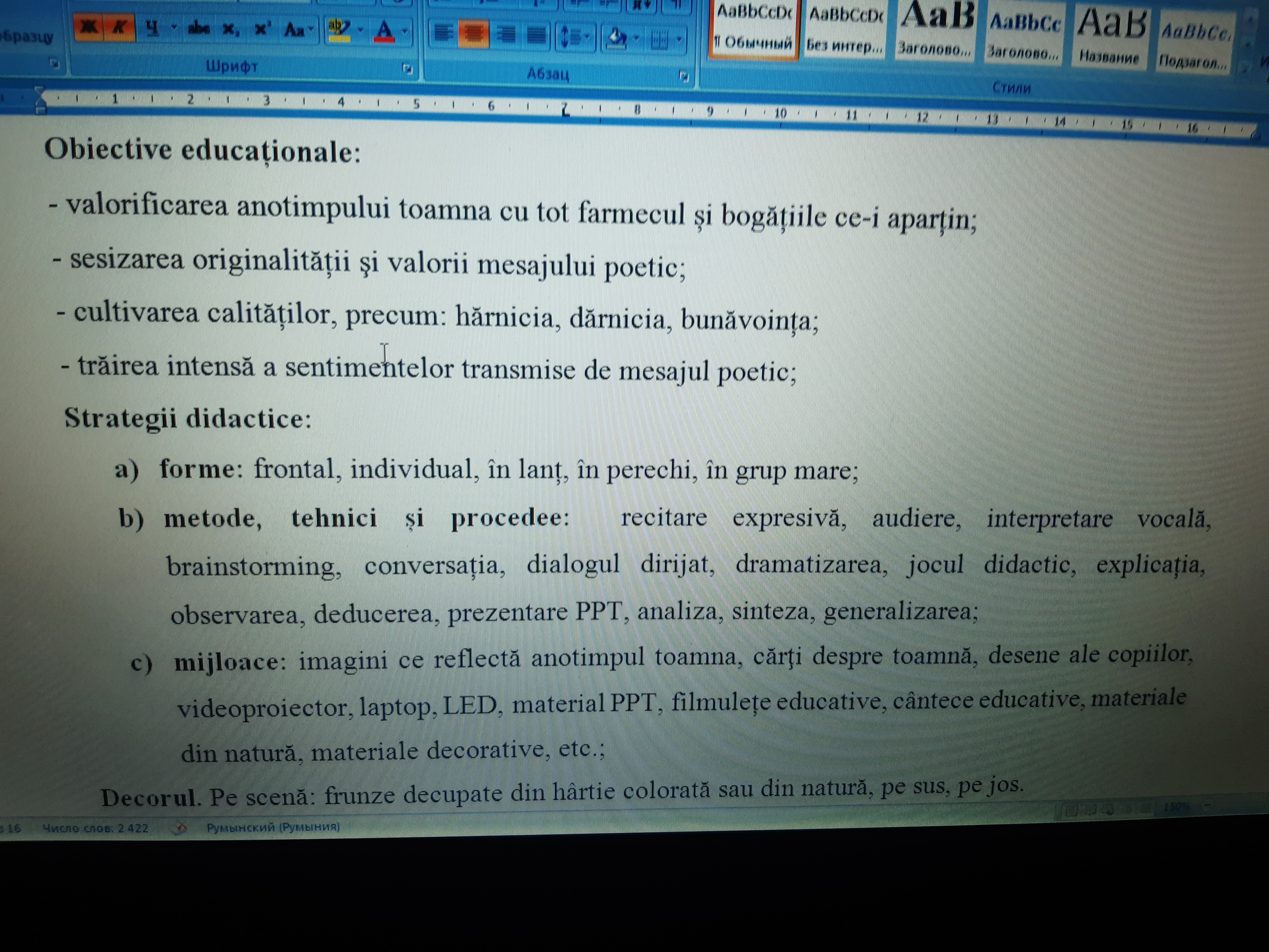 Scenariul didactic al acestei activități extracurriculare este redactat în format word, are 16 pagini. Acest scenariu didactic, poate fi utilizat la toate treptele de învățământ: primar, gimnazial, liceal,  inclusiv, și la treapta preșcolară. Este elaborat după cerințele metodice ale unei activități extracurriculare. Conține: ARGUMENT bine determinat, OBIECTIVE OPERAȚIONALE corect formulate, STRATEGIA DIDACTICĂ cu forme, metode, tehnici și procedee didactice, DECORUL SĂLII cu mijloace didactice, REFERINȚE BIBLIOGRAFICE scrise după cerințele actuale, cu indicarea ISBN-ului literaturii metodice. Scenariul didactic conține și linkurile la cântece, filmulețe educative, audiții, melodii, etc. DESIGNUL este interactiv, creativ și relevant. Poate fi utilizat și la activități transdisciplinare, la toate treptele școlare. Activitatea este bogată în conținut. Scenariul didactic este structurat corect, din punct de vedere metodic și bine gândit.  Este recenzat la CATEDRA ȘTIINȚE ALE EDUCAȚIEI de la UNIVERSITATEA de STAT „Alecu Russo” din Bălți și recomandat pentru publicare și utilizare.