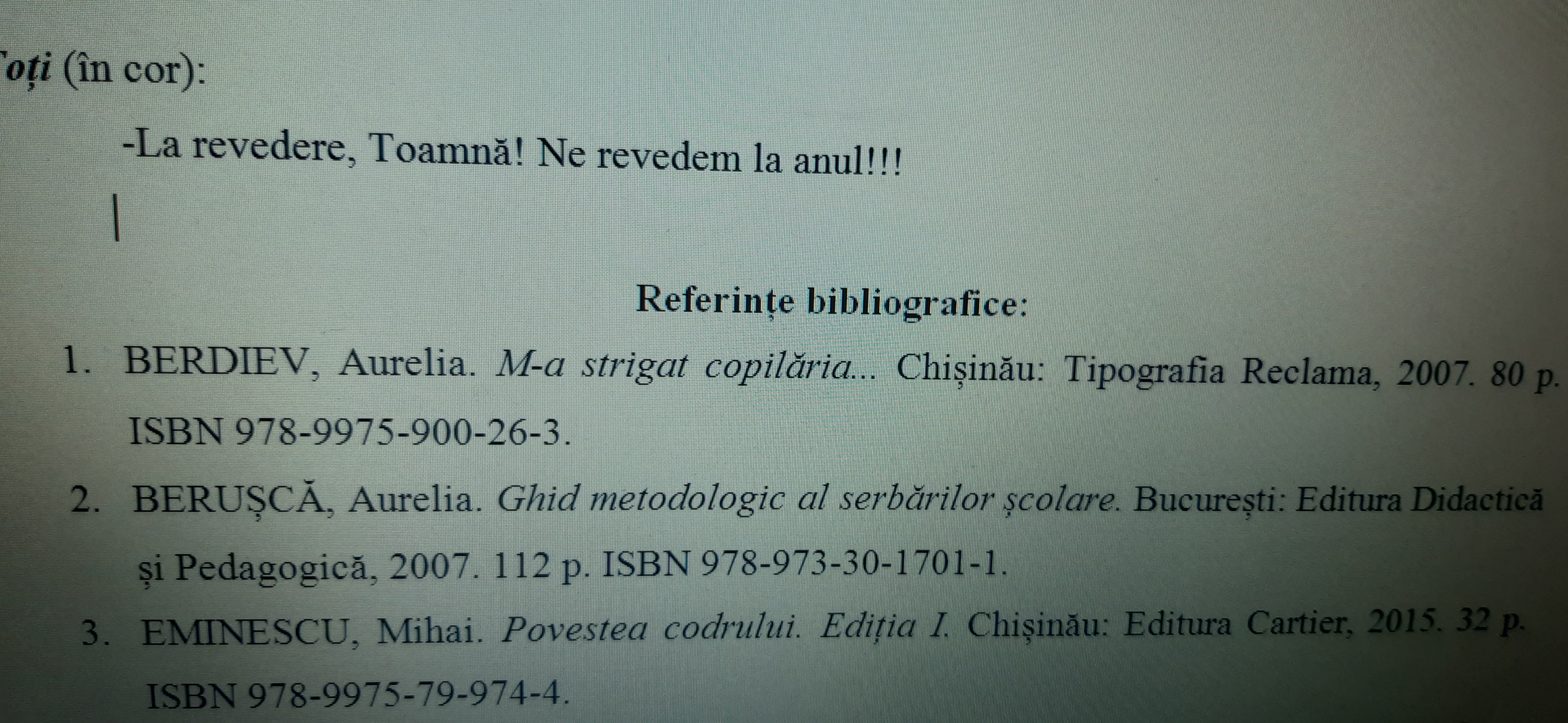 Scenariul didactic al acestei activități extracurriculare este redactat în format word, are 16 pagini. Acest scenariu didactic, poate fi utilizat la toate treptele de învățământ: primar, gimnazial, liceal, inclusiv, și la treapta preșcolară. Este elaborat după cerințele metodice ale unei activități extracurriculare. Conține: ARGUMENT bine determinat, OBIECTIVE OPERAȚIONALE corect formulate, STRATEGIA DIDACTICĂ cu forme, metode, tehnici și procedee didactice, DECORUL SĂLII cu mijloace didactice, REFERINȚE BIBLIOGRAFICE scrise după cerințele actuale, cu indicarea ISBN-ului literaturii metodice. Scenariul didactic conține și linkurile la cântece, filmulețe educative, audiții, melodii, etc. DESIGNUL este interactiv, creativ și relevant. Poate fi utilizat și la activități transdisciplinare, la toate treptele școlare. Activitatea este bogată în conținut. Scenariul didactic este structurat corect, din punct de vedere metodic și bine gândit.  Este recenzat la CATEDRA ȘTIINȚE ALE EDUCAȚIEI de la UNIVERSITATEA de STAT „Alecu Russo” din Bălți și recomandat pentru publicare și utilizare.