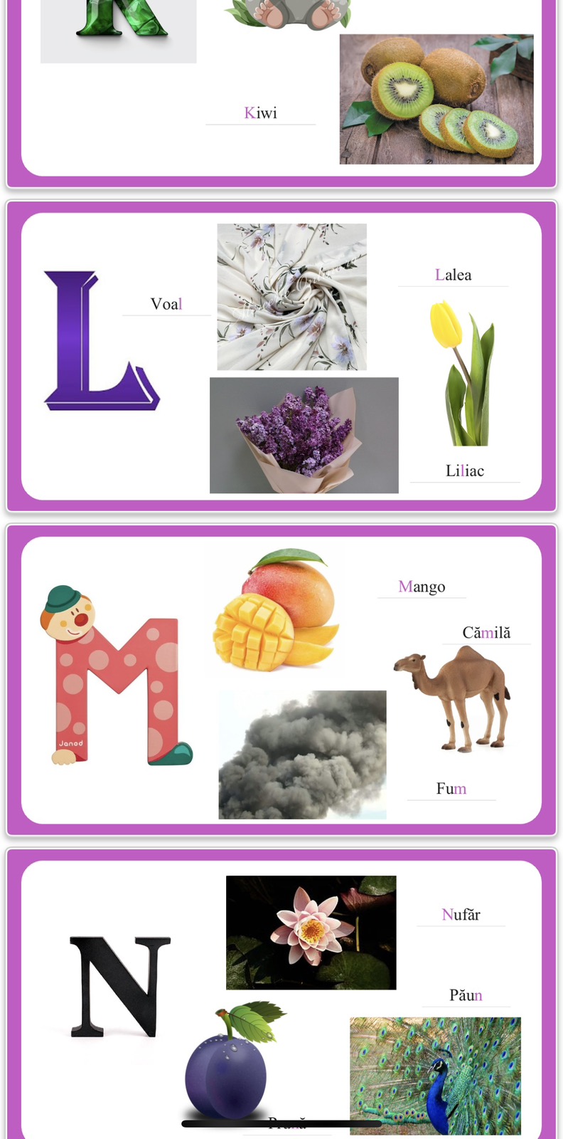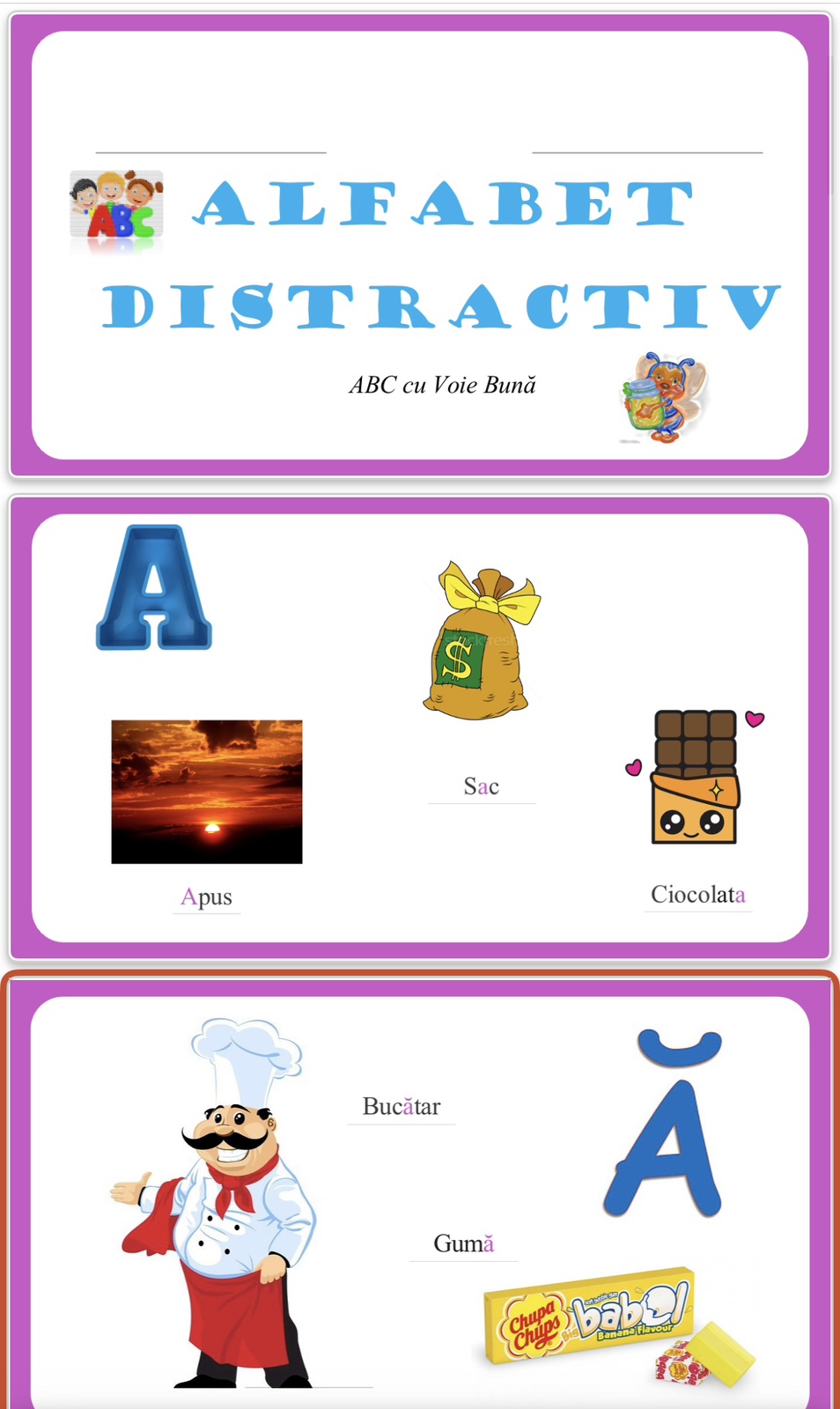 „Alfabet Distractiv – ABC cu Voie Bună” este un material digital conceput pentru a face procesul de învățare al literelor din alfabet cât mai plăcut și eficient pentru copii. Fiecare literă este prezentată într-un mod jucăuș, cu sprijin vizual prietenos, care stimulează recunoașterea literelor și dezvoltarea vocabularului.