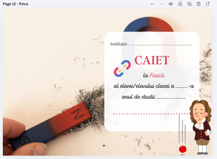 Copertă de caiet la Fizică,, disponibilă exclusiv în format PDF 📄. Produsul este destinat imprimării 🖨️ și completării manuale ✍️.