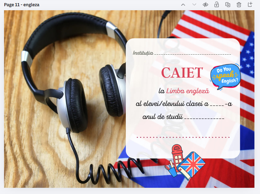 Copertă de caiet la Limba engleză, , disponibilă exclusiv în format PDF 📄. Produsul este destinat imprimării 🖨️ și completării manuale ✍️.