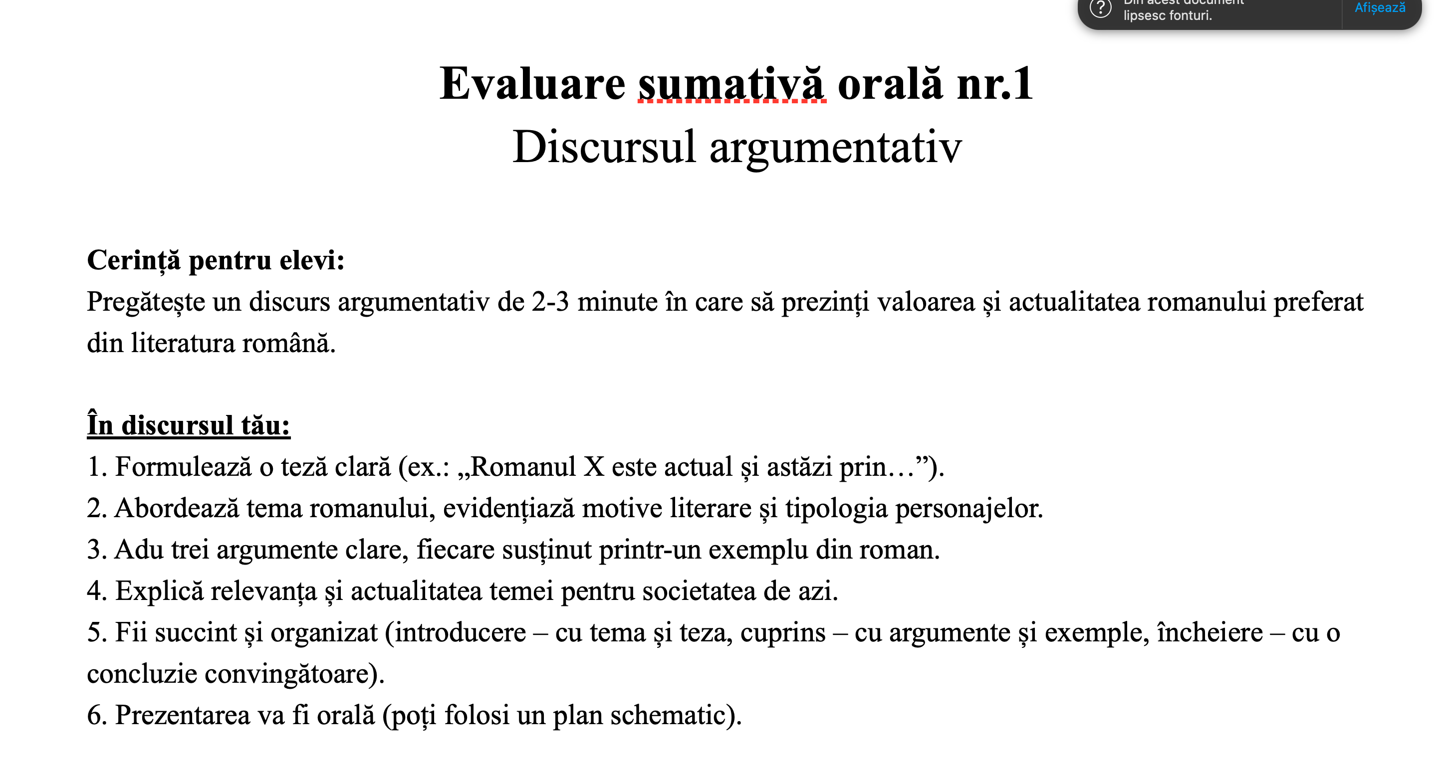 Acest produs didactic oferă profesorilor un model complet de evaluare sumativă orală prin discurs argumentativ, destinat elevilor de clasa a XI-a. Documentul conține cerința clar formulată și o grilă de apreciere detaliată, ușor de aplicat, care sprijină atât corectitudinea evaluării, cât și dezvoltarea competențelor de exprimare orală și argumentare ale elevilor.