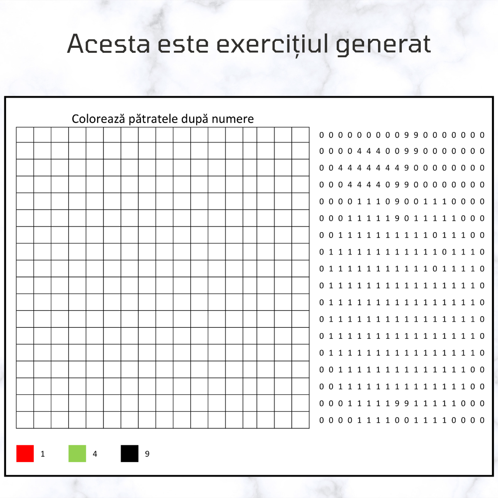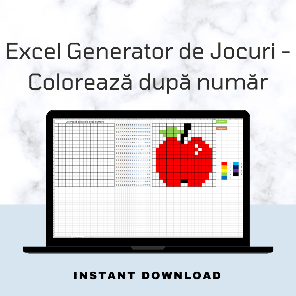 Acest fișier Excel este un instrument educațional, perfect pentru profesori și părinți. Printr-un concept simplu și distractiv, copiii sunt încurajați să coloreze desene folosind coduri de culoare asociate numerelor.