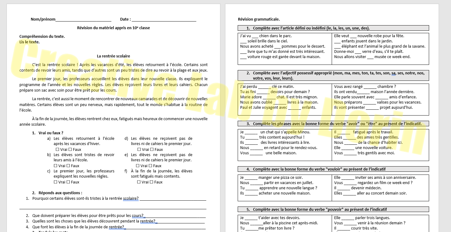 Această fișă de lucru este o revizuire completă a materialului învățat în clasa a 10-a, destinată elevilor care învață limba franceză (nivel A1.1) . Conține exerciții diverse pentru a exersa competențele lingvistice esențiale, cum ar fi: