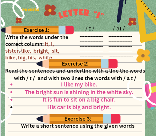 Fișa data conține 5 exerciții de fonetică pentru litera „i” (/ ɪ / / aɪ / ), accentul este pus pe cuvintele studiate la ore: