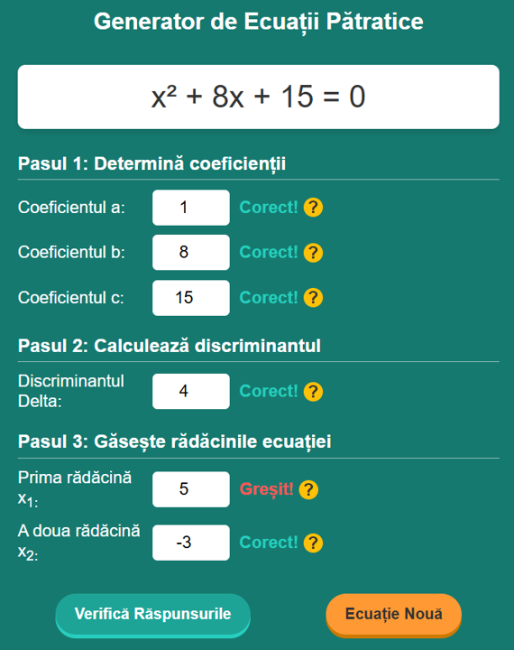Acest generator a fost conceput special pentru a crea ecuații care au garantat soluții întregi (folosind metoda relațiilor lui Viète inversate). Acest lucru elimină frustrarea calculării rădăcinilor complicate cu zecimale, permițându-ți să te concentrezi pe înțelegerea logicii formulei patratice.