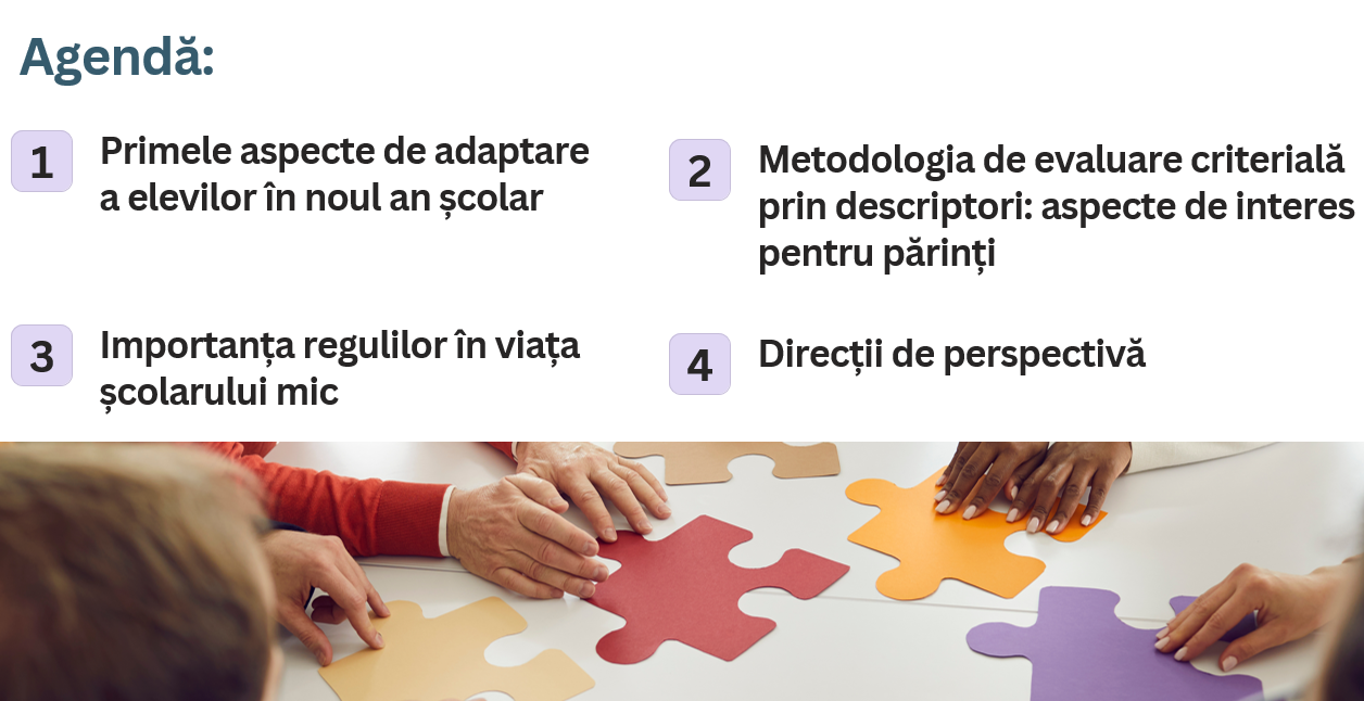 La prima ședință din an cu părinții se va aminti de Metodologia de evaluare criterială prin descriptori și se vor trasa direcții de perspectivă în colaborarea cu părinții.