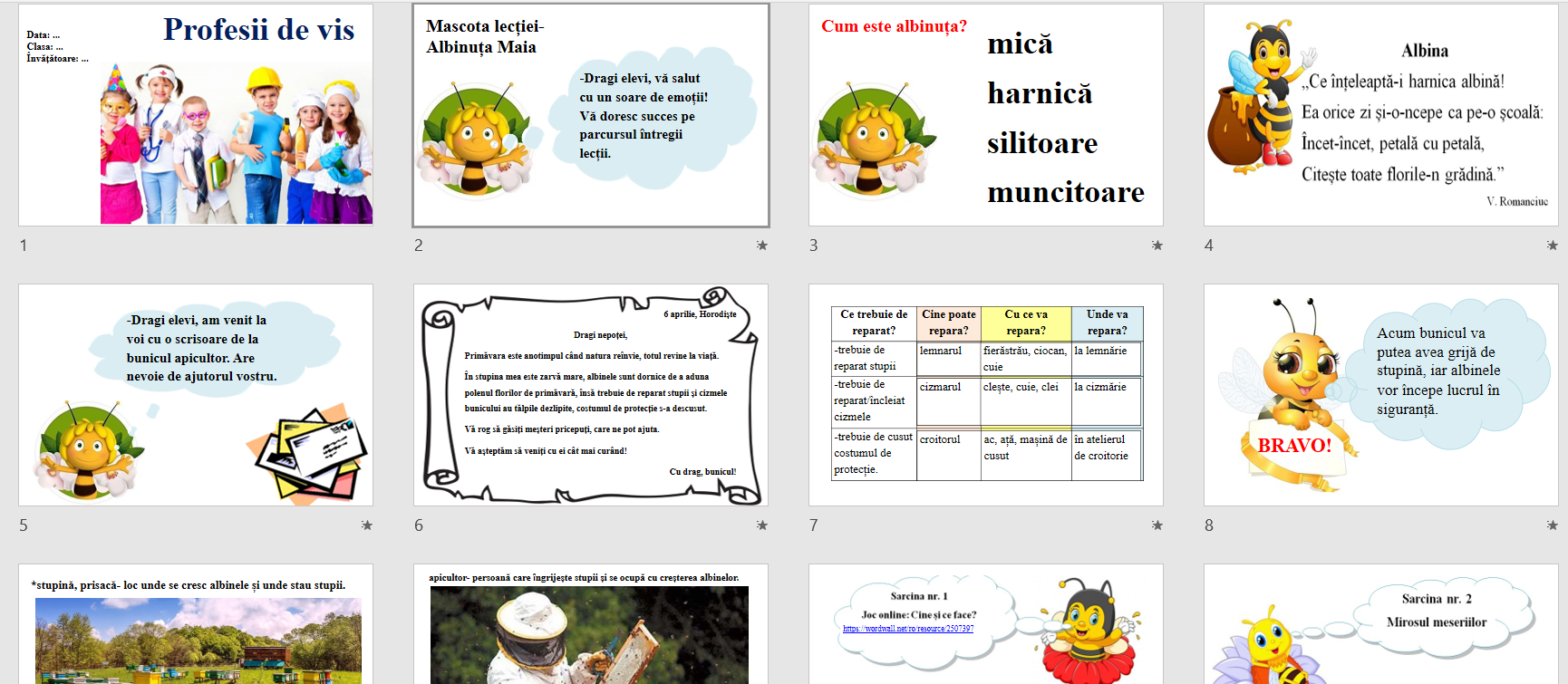 Prezentarea interactivă, editabilă, despre profesii, potrivită pentru elevii din clasele primare, conține 28 de slide-uri (diapozitive).