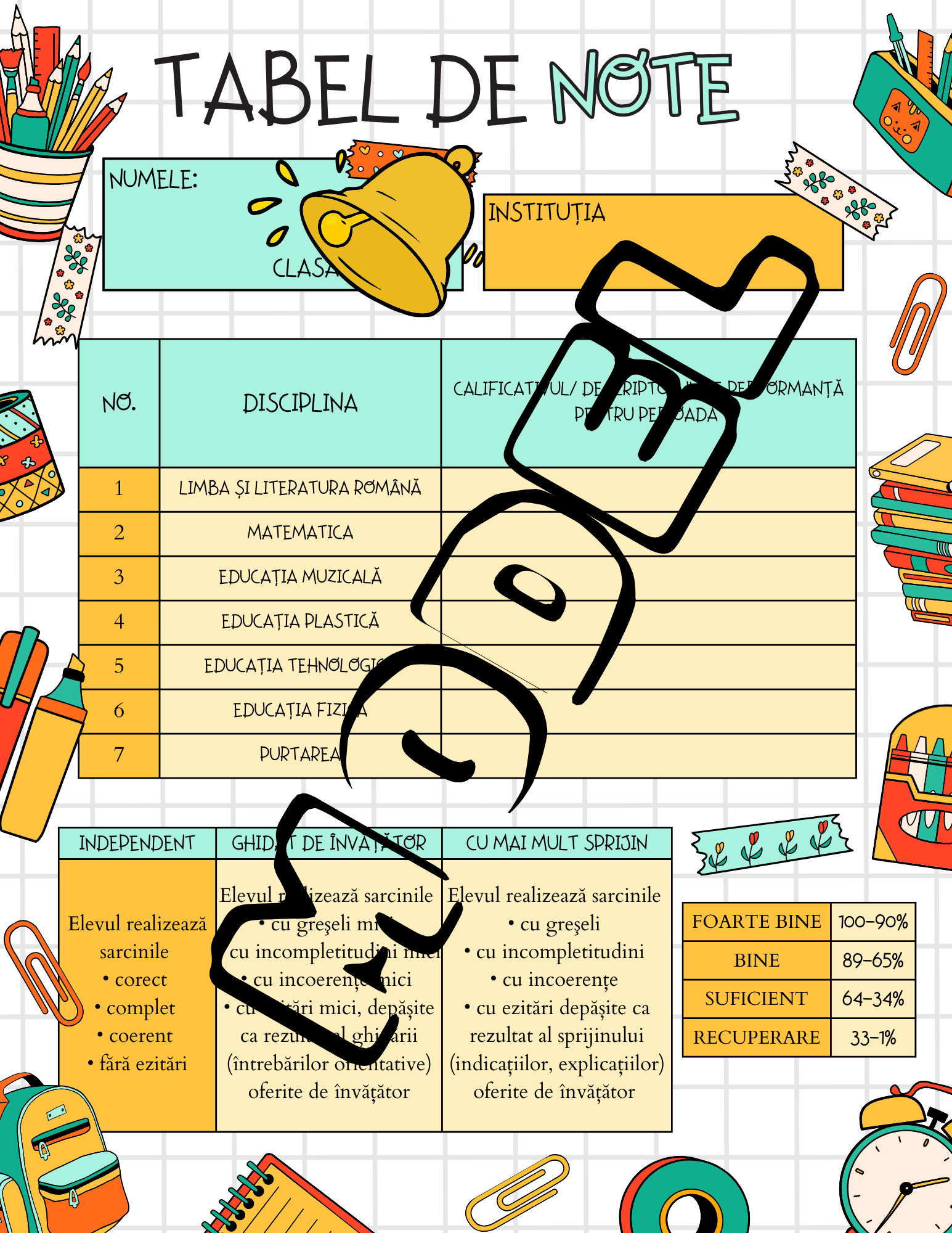 Acest tabel de note poate fi folosit la final de semestru sau la final de an pentru a introduce Descriptorii de performanță sau Calificativele.
