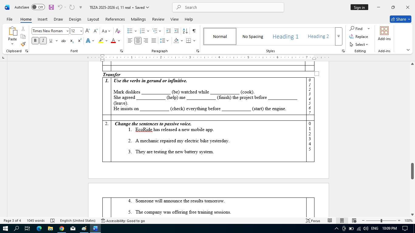 Model teza clasa a 11-a. Aici este inclusa diateza pasiva, text,adevarat fals, raspunde la intrebari, gaseste sinonime,completeaza forma corecta a cuvintelor, gerunziu si infinitivul.