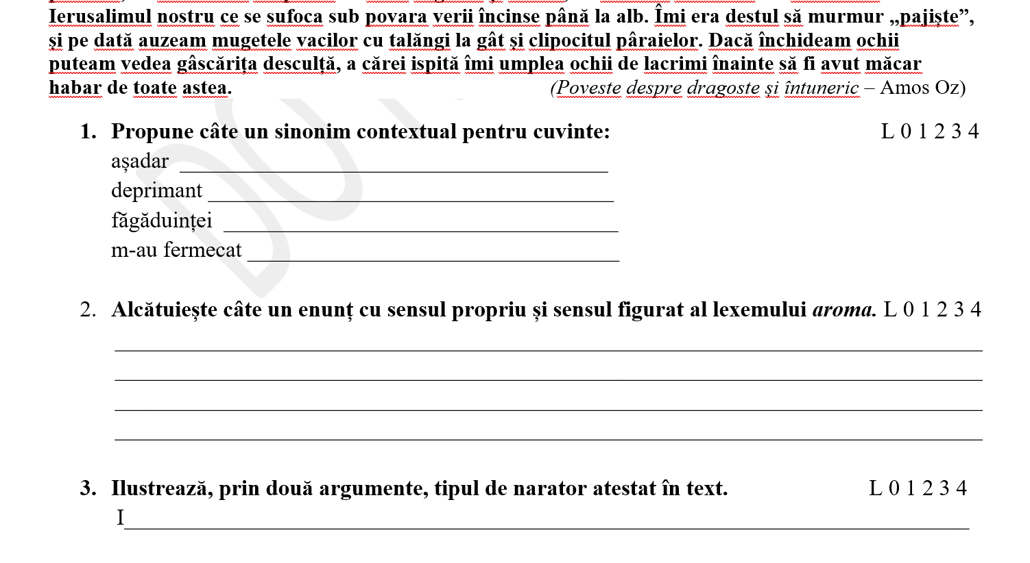 Pun la dispoziție două modele complete de teză, fiecare construită pe baza unui fragment epic și a șapte exerciții cu dificultate variată: sinonime contextuale, sens propriu/figurat, tipul de narator, figură de stil, motiv literar, apartenența la genul literar și eseu structurat.